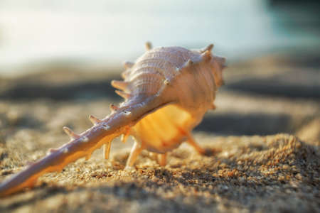 Sea shell lies on the sandy seashore in the rays of the setting sun