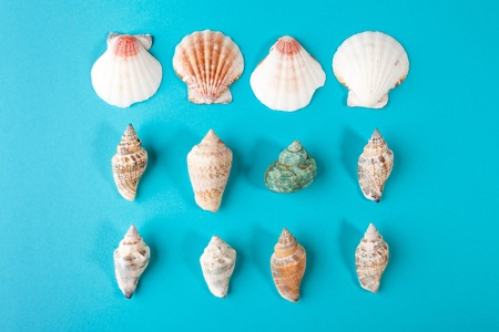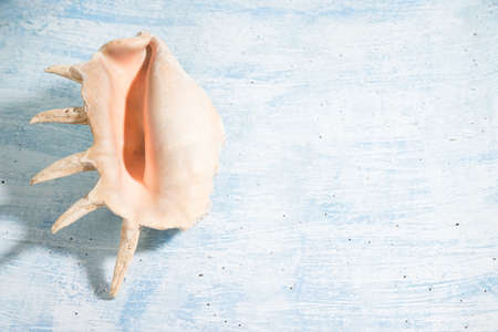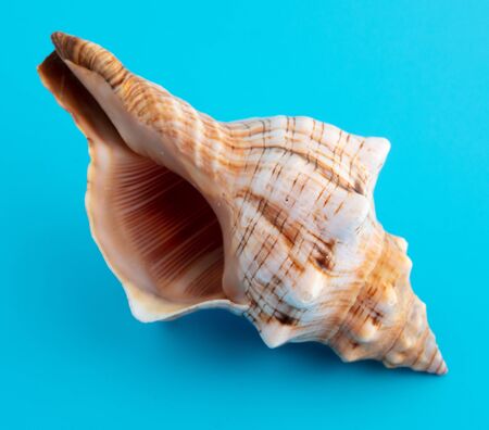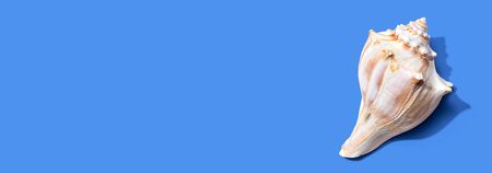 A large seashell lies on a blue background. A place for Kopi space.Horizontal orientation