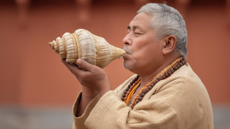 A man in traditional attire passionately plays a large shell, creating music in a tranquil outdoor environment, celebrating culture and craftsmanship with serenity.