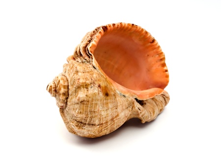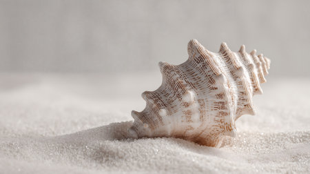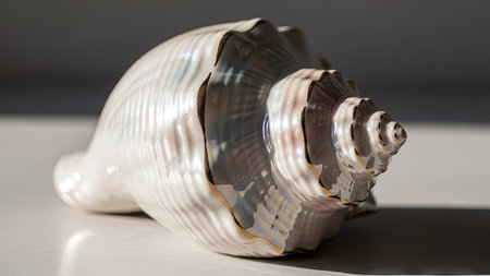 A close-up captures a pristine conch shell, its pearlescent surface reflecting light. The shell exhibits a textured exterior with a prominent spiral. Soft shadows define the form against a neutral background. This image is suitable for various commercial uses, including website design or editorial content.