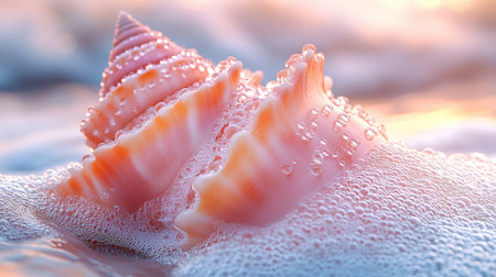 A serene close-up of delicate pink seashells adorned with sparkling dewdrops, illuminated by soft natural light, symbolizing tranquility.