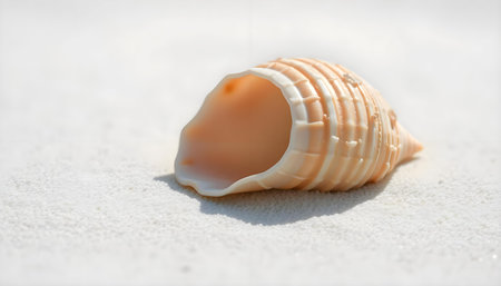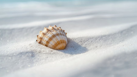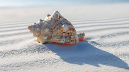 A beautiful, spiraled seashell rests on pristine white sand, casting a soft shadow under bright sunlight. This close-up shot evokes themes of summer vacations, tropical beaches, and the simple beauty of coastal nature.