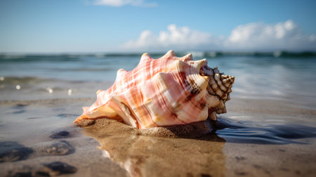 Large conch shell with pink interior and striped exterior resting on glistening wet sand. ocean waves gently lap in the background under a bright sun, evoking summer and vacation.