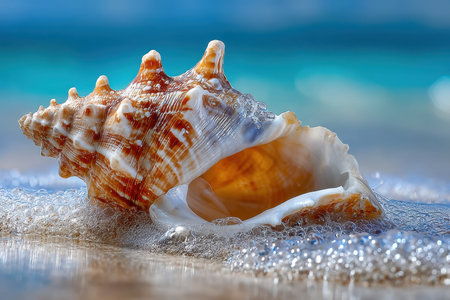 A stunning shell lies on the warm sand while waves gently lap at its base capturing the serene beauty