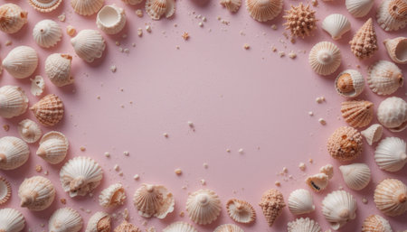 Delicate sea shells are spread around a soft pink background, forming a charming decorative border.