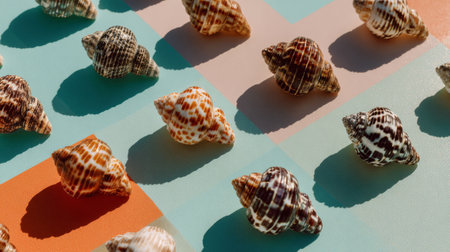 Colorful seashells arranged neatly on a geometric surface during daylight hours
