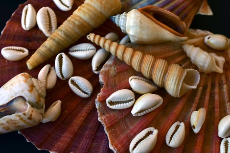 A collection of seashells arranged in a pattern on a black background, emphasizing their unique shapes and textures.