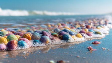 Rainbow-colored seashells bobbing on gentle waves, set against a beach shoreline in the background