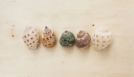 Seashells on blue wood with copy space, sea vacation background with copy space on wooden planks