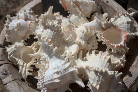 Closeup view of an arrangement of spiny seashells from marine snails or gastropods on sand viewed from above