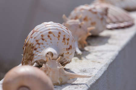 Old weathered conch shell background. Tropical sea conch wallpaper