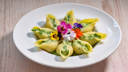 Pasta shells filled with fresh greens and topped with edible flowers.