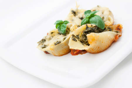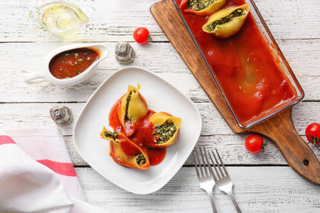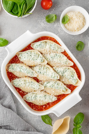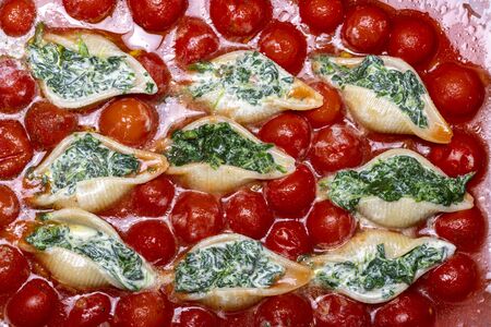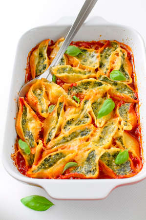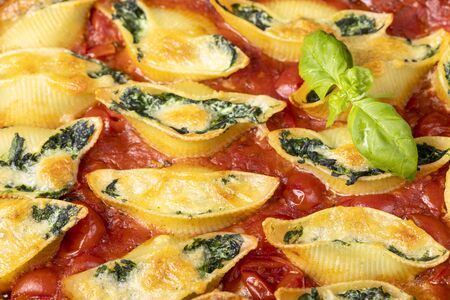 Pasta shells stuffed with cheese and spinach, seasoned with herbs to taste and baked in tomato sauce. Italian cuisine. Gourmet meal.
