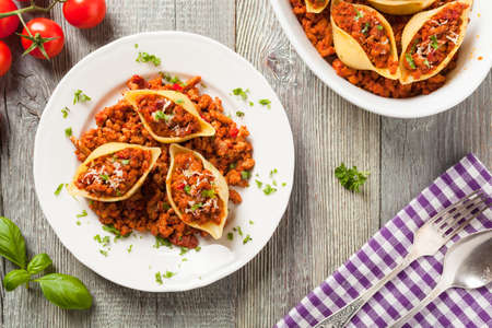 Italian pasta Conchiglioni Rigati stuffed with meat.
