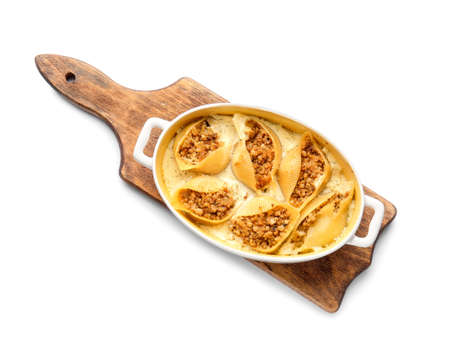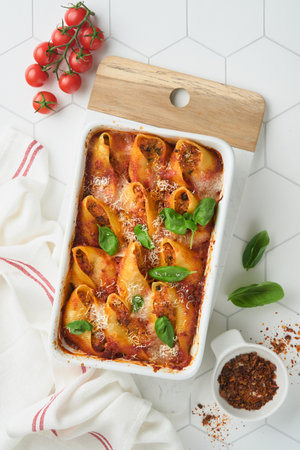 Cannelloni or conchiglioni. Baked stuffed pasta shells with bolognese meat sauce, tomatoes, basil on white tile modern table. Traditional Italian bolognese baked pasta with parmesan. Italian food.