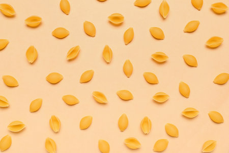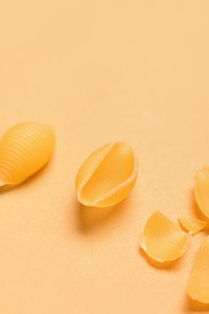 A detailed, textured view of dry conchiglie pasta, showcasing its ridged surface and hollow shape, perfect for culinary inspiration