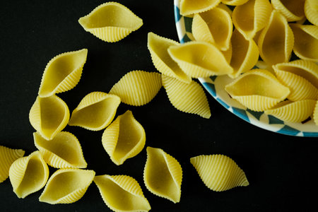 Several pasta shells are suspended air creating dynamic visual dark background. arrangement emphasizes their unique shapes and textures.