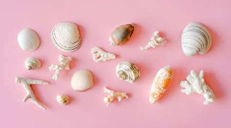 Different white seashells and corals on pink background.