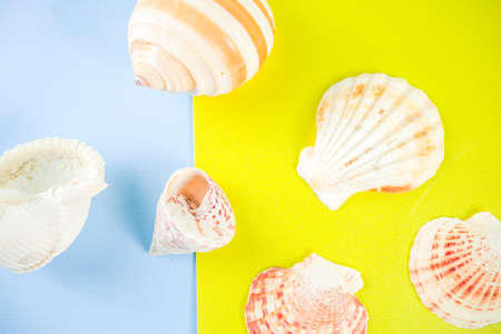 Sea shells on color background, top view. Summer concept.
