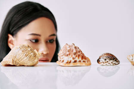 Beautiful african american woman looking on different seashells on white background.