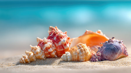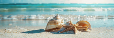 Seashells scattered on a serene beach with soft sand and gentle waves in the background, capturing the peaceful essence of a coastal environment. ideal for themes of relaxation, holidays, and natural beauty.