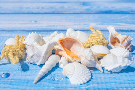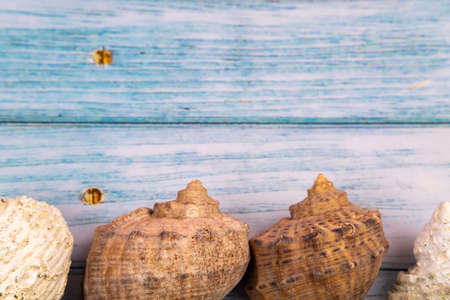 Seashells on blue wood with copy space, sea vacation background with copy space on wooden planks
