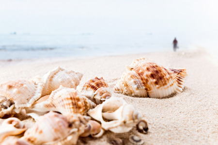 Close-up of two shells on the beach with sea on background, shallow DOF, soft focus.