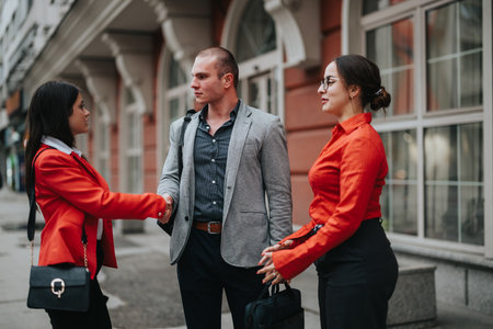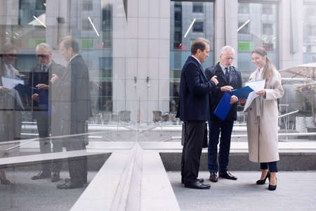 Confident businesspersons in formal wear having conversation about banking and financial markets in front of office building.