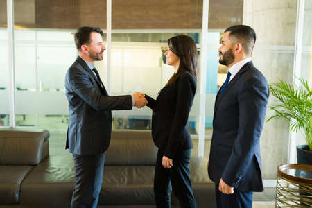 We have a deal. Professional businessman shaking hands with two business partners and sales representatives after making a sales deal