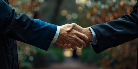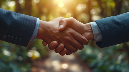 Two men in formal suits shake hands outdoors with a warm, sunlit bokeh background of green and gold colors, suggesting a successful agreement.