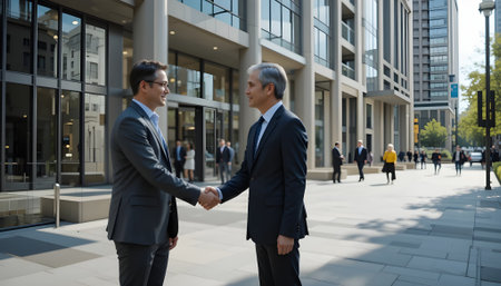 Confident business partners meeting, shaking hands near office building. Cooperation and partnership concept.