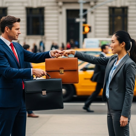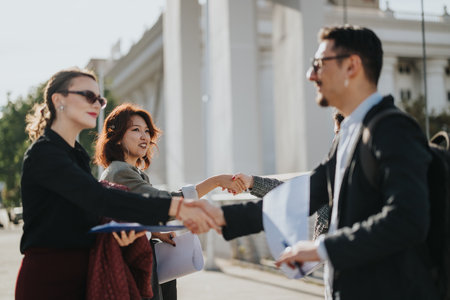 Business colleagues shake hands outdoors after a meeting, exchanging documents and smiles.