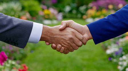 Close up view of two hands shaking hands in a garden setting, featuring a blurred background of colorful flowers and green grass. The hands are positioned in a handshake, and the dominant hand has wrinkles. The hand of one person is dressed in a gray suit, the other in a blue blazer. Soft natural lighting highlights the scene, showcasing a positive and collaborative atmosphere.
