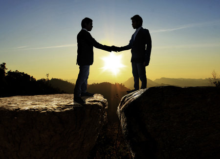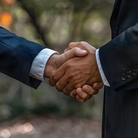 Two hands shake firmly in agreement, representing a moment of connection and mutual understanding between the individuals. The setting is natural and serene.