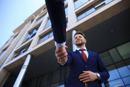 Business man shaking hands. Two businessmen handshake outdoor. Handshake business people. Handshake of two business man in suit top view. Partnership and leadership. Success entrepreneurship.