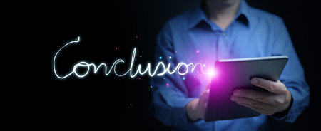 Hand holding tablet generating light effect writing conclusion word, symbol of final concept, digital result, project completion, creative business strategy and professional communication.