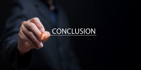 Close up hand holding pen highlighting conclusion text, symbol of final concept, result summary, project completion, leadership communication and business presentation ending strategy.