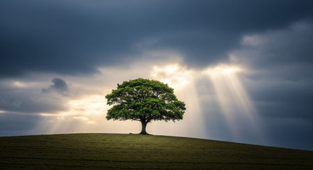 A single, resilient tree stands silhouetted against a serene green sky, a powerful symbol of life, growth, and enduring hope. This minimalist landscape evokes a sense of peace, tranquility, and quiet strength in the face of solitude.