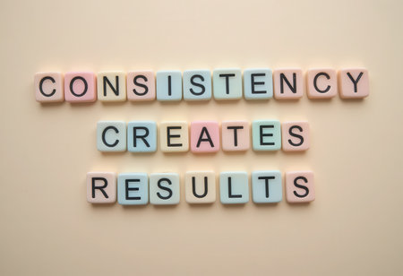Colorful letter tiles spell out the motivational phrase Consistency Creates Results, emphasizing the importance of persistence in achieving success and personal goals.