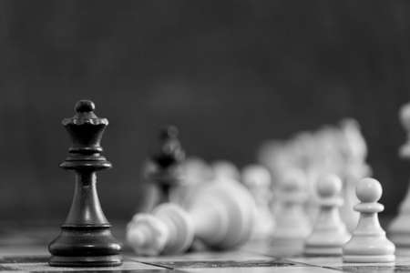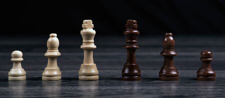 chess kings and various chess pieces arranged in a row on a wooden background as a still life