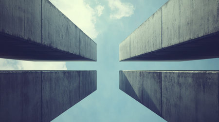 A stunning view of four concrete pillars reaching towards a clear blue sky, showcasing modern architectural design and urban tranquility. Perfect for memorial themes.