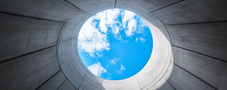 An open concrete structure reveals a bright blue sky filled with puffy white clouds. The interior space features a rough textured floor and support pillars. The scene is illuminated by natural light and could be used for architectural concepts or representing freedom. The image is suitable for various commercial purposes.