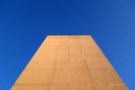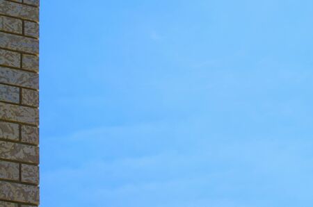 Beige color painted empty wall in contrast of clear blue sky background, texture. Copy space, ad template, low angle view.