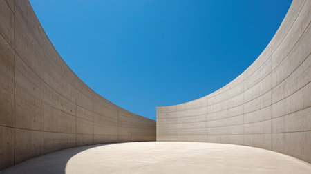 Experience an artistic outdoor space featuring smooth curved concrete walls under a clear blue sky, representing modern design and tranquility in minimalism.