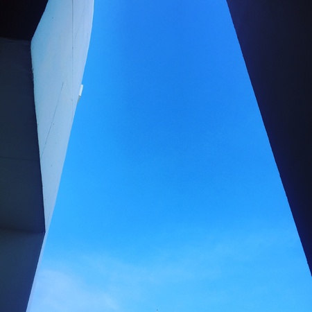 A perspective shot of two smooth, grey concrete walls meeting in the middle to form a pathway. The walls stand tall against a bright, cloudless blue sky. The ground is a smooth, light grey concrete surface with a slight sheen, reflecting the blue of the sky.