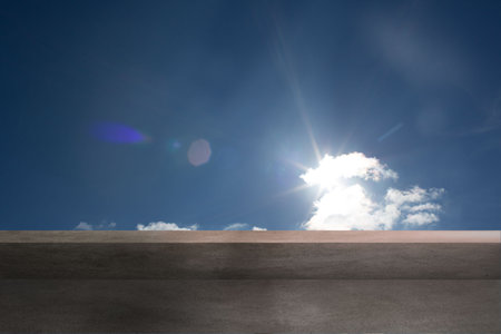 Raw cement or concrete outdoor floor shelf is blank template with natural blue sky and clouds blur with sun light background for display the products.