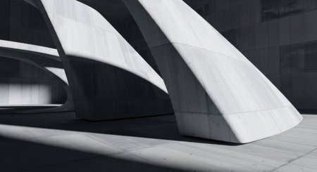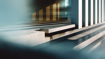 Sleek industrial style digital artwork with smooth glossy surfaces, bold harsh lighting effects, and striking shadow contrasts evoking refined urban sophistication. Perfect for architecture visualizations, interior mockups, construction branding, urban design graphics, and modern web backgrounds targeting designers and developers. Versatile high-contrast comp... AI-generated digital illustration. AI-generated illustration.