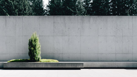 A minimalist scene featuring a single green shrub set against a gray concrete wall, showcasing modern architectural design and a tranquil outdoor environment.