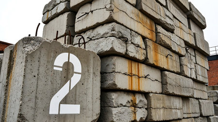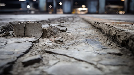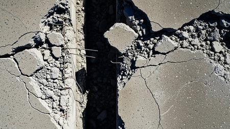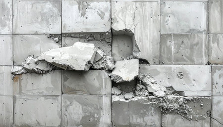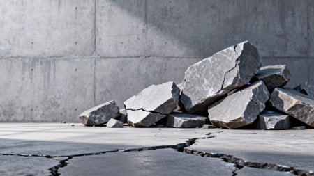 Construction disaster scene with cracked concrete blocks and dusty surroundings