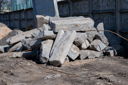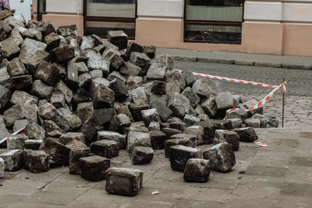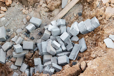 Dismantled paving slabs. Reconstruction of the sidewalk in the city. Construction work on the improvement of the territory. close-up. background